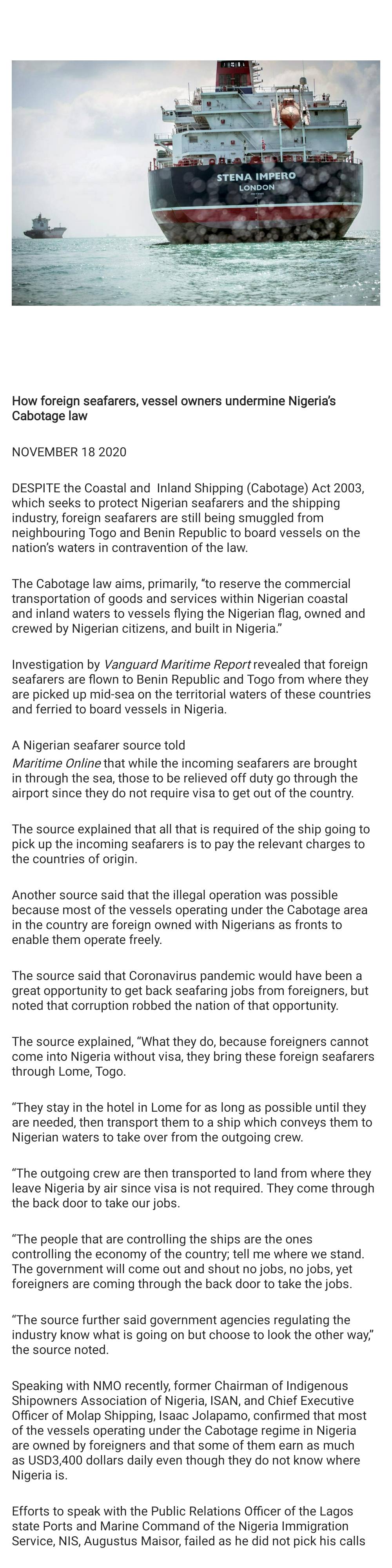 How foreign seafarers, vessel owners undermine Nigeria’s Cabotage law