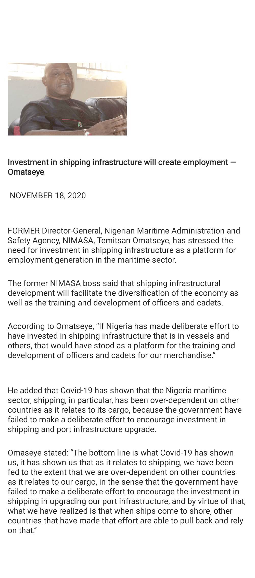 Investment in shipping infrastructure will create employment —Omatseye