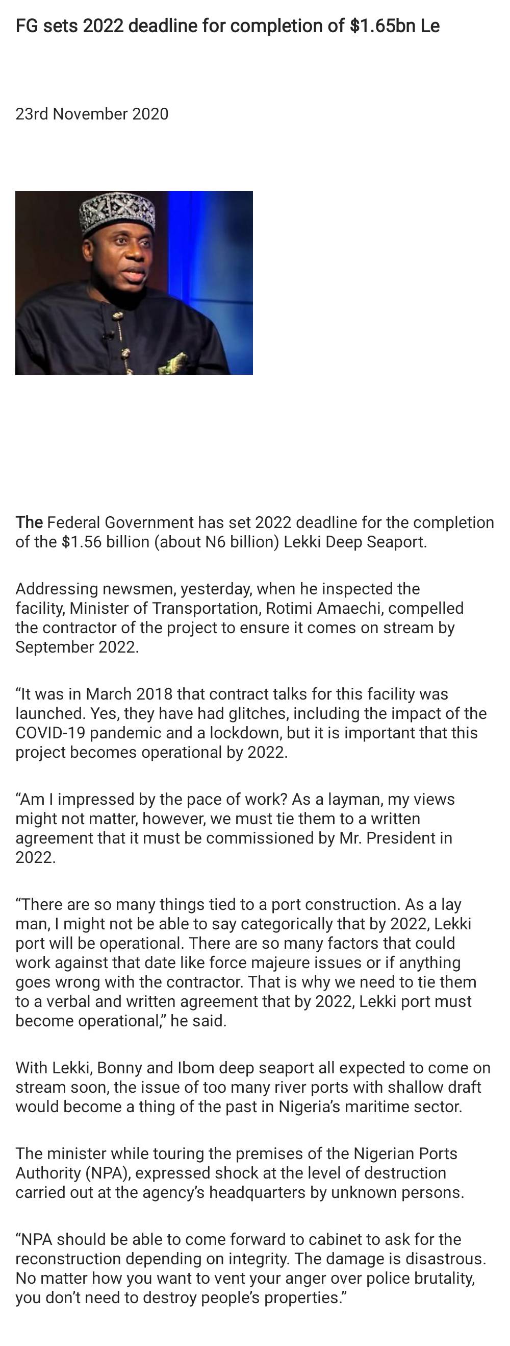 FG sets 2022 deadline for completion of $1.65bn Lekki Deep Seaport